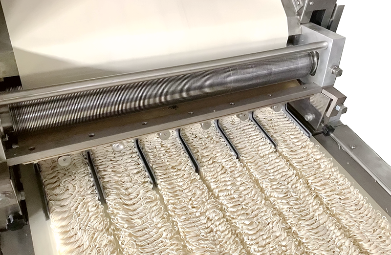 Aumentando il rapporto di pressatura, il rapporto tra lunghezza e larghezza, il glutine nell'impasto viene allungato e schiacciato maggiormente, creando una rete di glutine più stretta. Questa struttura a rete può bloccare efficacemente l'umidità e le bolle d'aria nell'impasto, prevenirne un'eccessiva espansione o deformazione durante la frittura e mantenere stabili la forma e la consistenza del prodotto. Allo stesso tempo, la rete del glutine può anche assorbire il grasso, rendendo gli spaghetti istantanei fritti più pieni e ricchi di gusto.